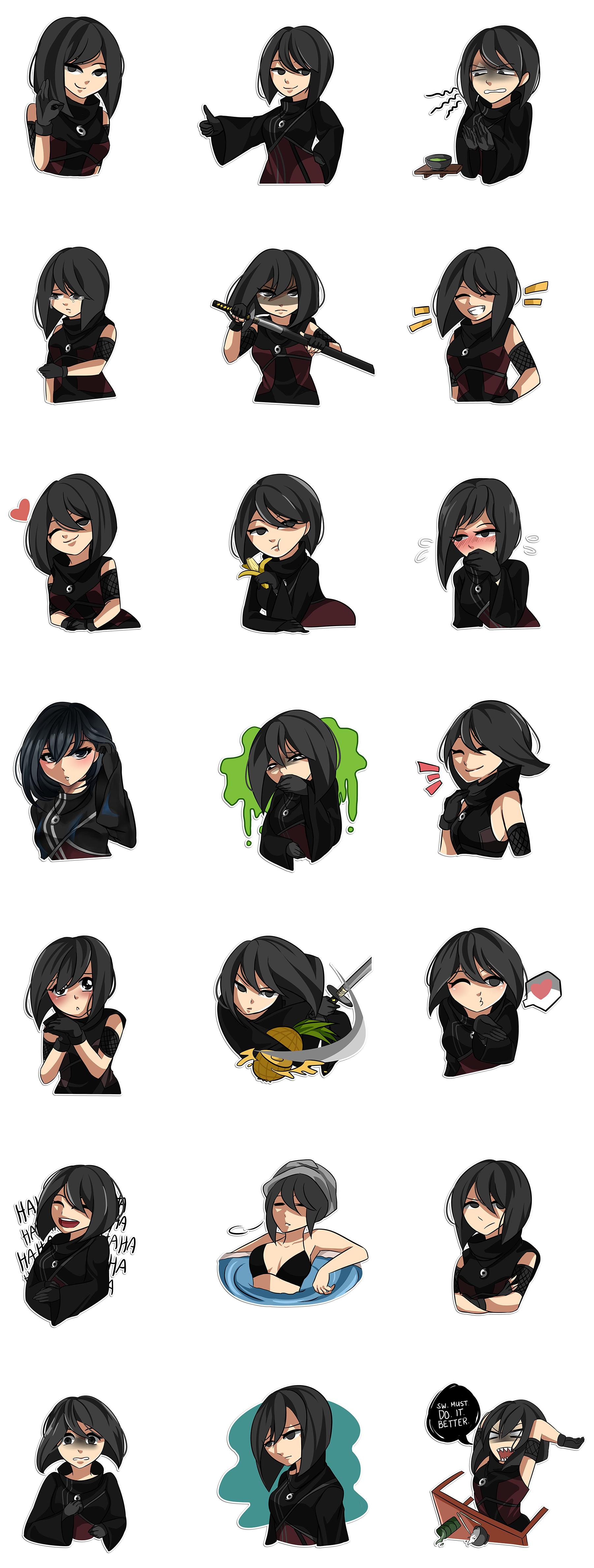 The community all pitched in to the creation of Onna's style. Japanese inspired? Obviously. Super anime? No. Japanese traditional garb? Maybe a fantasy urban look is better. They were even so excited that they wanted several outfits, and we were happy to comply. Half the stickers in one outfit, and half in the other. Design by committee can sometimes be a great pain, but this process was quite smooth since everyone seemed to more or less be on the same page.
